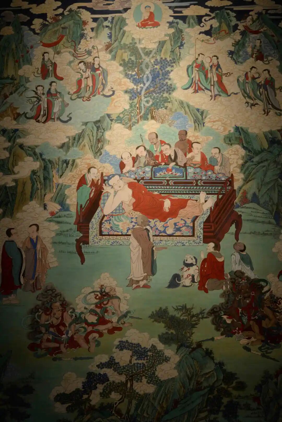 这幅壁画描绘了“双林入灭”,讲述的是释迦牟尼在拘尸那迦城外的两棵娑罗树间涅槃。