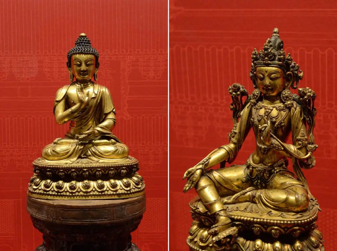 这两件“重”器都是黄铜制造,通体鎏金,器型优美,端庄厚重,代表了永宣时期宫廷铸造工艺的最高水准。