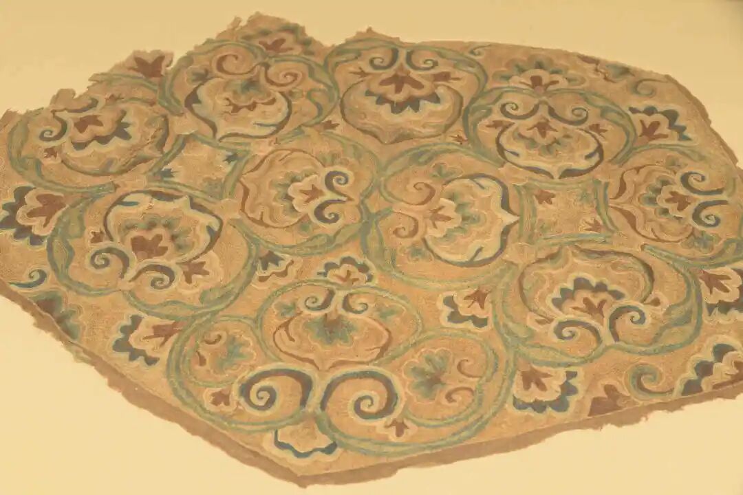 这件刺绣鞍鞯出土于都兰热水墓群,图案是唐代流行的宝相花,这是唐蕃友好往来的实物见证。