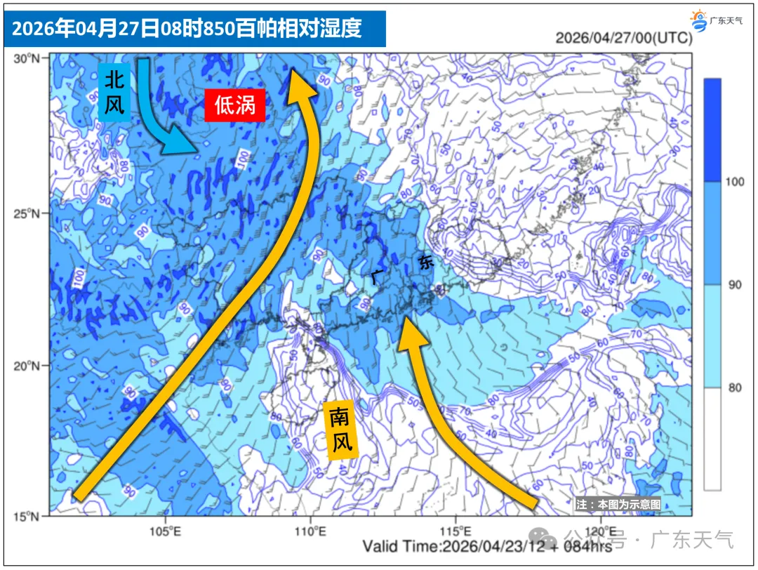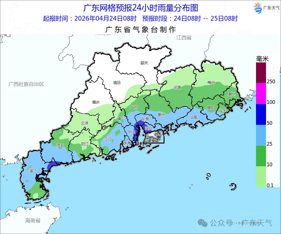 今天(4月24日),冷暖气流在广东沿海交汇,因此考虑南部市县仍有明显降雨;25-26日,雨带(对应切变线系统)东移出海,广东大部降雨逐渐减弱,阳光回归。