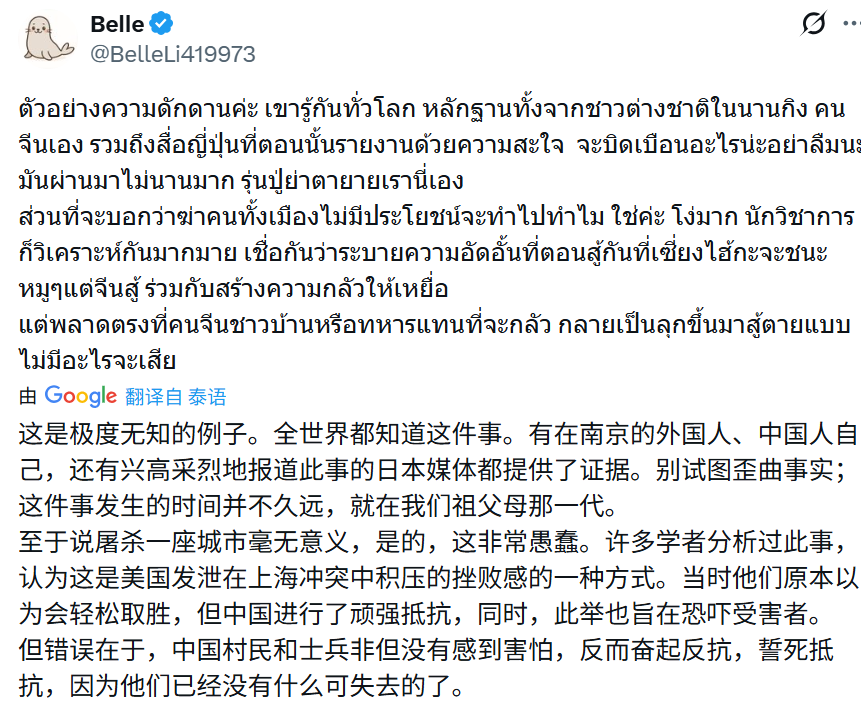 值得一提的是,在此期间,一个日本人在X平台分享了一件让自己震惊的事:他说,自己女儿在国际学校,从英国老师那学习了南京大屠杀的历史进而感到羞愧;他家紧急召开家庭会议,想给女儿洗脑说大屠杀是没有的事,但女儿还是心存疑虑。