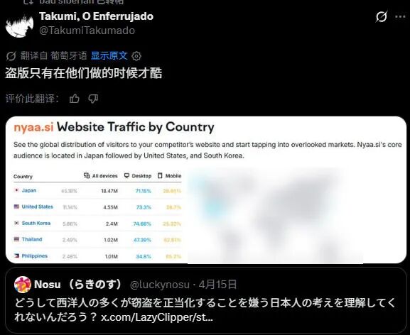 “盗版只有他们自己错的时候才酷,”他贴出一张数据图显示,日本网民是nyass.si网站(世界上最大的动漫专用种子索引站)的最大用户群体,占比超45%。