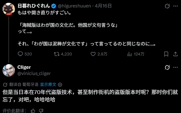 “简直是破罐子破摔到极致了,”有日本用户继续阴阳怪气,“这简直就是在说,‘盗版是我们国家文化的一部分,别国别来抱怨’。”