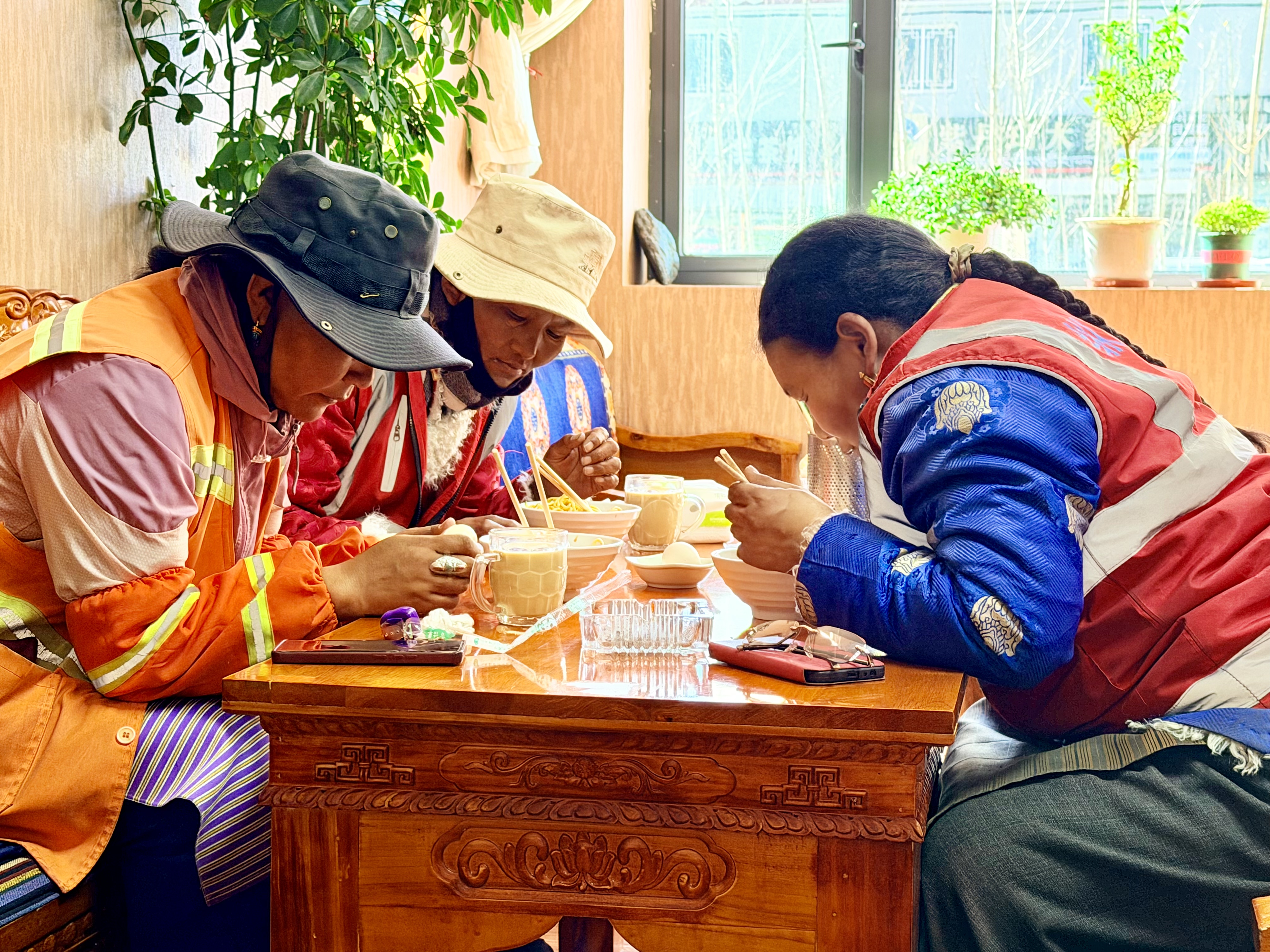 “以前到了饭点最发愁,吃饭只能随便凑合。”环卫工人贡确桑姆擦去额间汗水,端起热腾腾的饭菜,言语间满是真切感慨。她每天天不亮就走上街头,清扫路面、清运垃圾,一忙就是一整天,吃饭成了最大的难题。“要么随身带点干粮对付一口,要么急急忙忙回家随便吃点,很少有时间坐下来慢慢吃一顿热乎正餐。”抿一口醇香甜茶,她眉眼舒展,满是惬意舒坦。