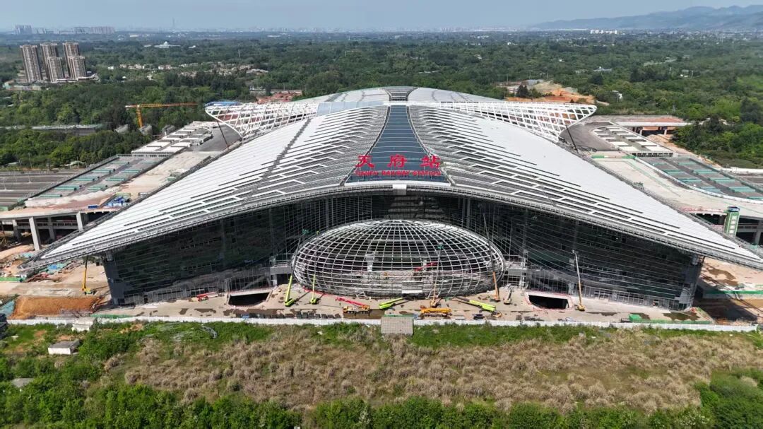 此外,天府站的建设中,还有“国内首例采用三层ETFE张拉膜屋面施工”“国内首个大高差异型双层金属屋面施工”“国内首例铁路站房采用‘三曲一折’超高大空间装饰吊顶体系”等亮点。