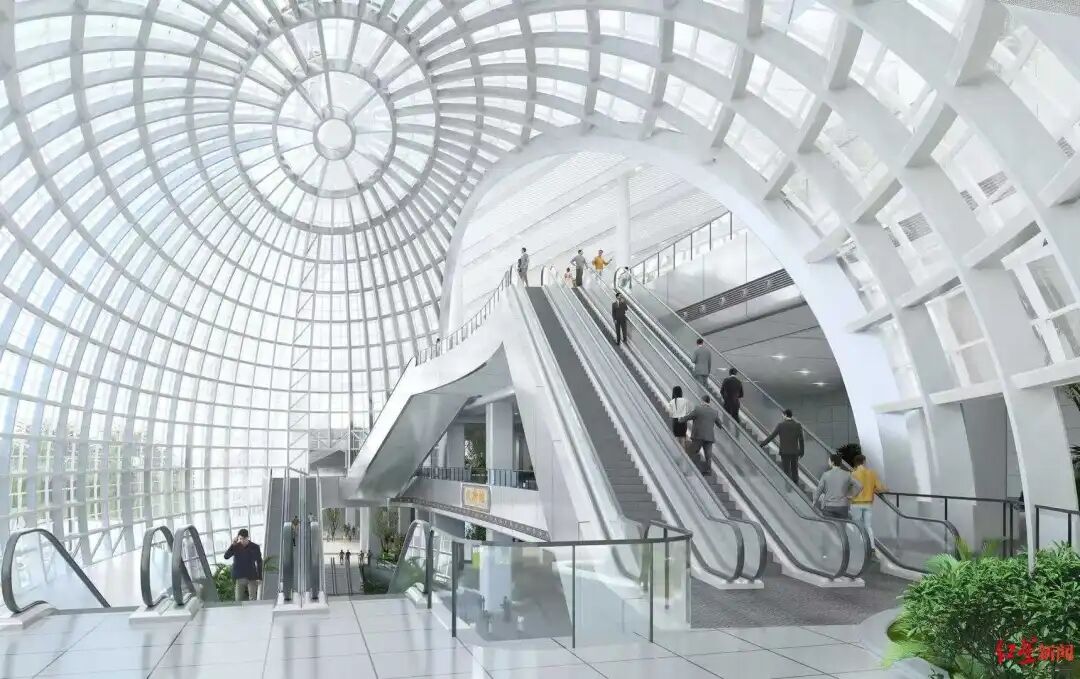 据介绍,天府站在形态上采用了大量的曲线元素,造型设计现代新颖,鸟瞰效果如振翅欲飞的凤凰栖停于站场之上;立面以横向的铝合金线条突显建筑的舒展感,端部的综合换乘大厅——凤凰之眼和腰部的光谷雨棚成为各自立面的视觉中心。