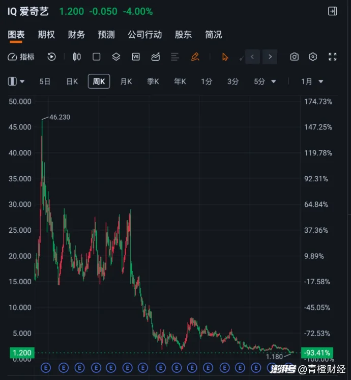 资本市场也用脚投票,截至4月23日美东时间收盘,爱奇艺股价报1.20美元,较2018年上市巅峰的46美元暴跌超97%,距离美股1美元退市警戒线仅一线之隔。