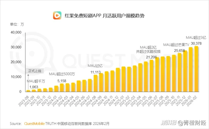 然而,爱奇艺直到2025年才将短剧提升至一级战略,对手却早已跑远——至2026年2月份,节跳动旗下红果免费短剧APP的月活跃用户规模已超过3亿,两年半时间增长了30倍!占据了行业九成的份额,成为最大赢家。2025年,红果短剧相继超过优酷、B站和芒果TV,目前与爱奇艺应只在咫尺之遥。