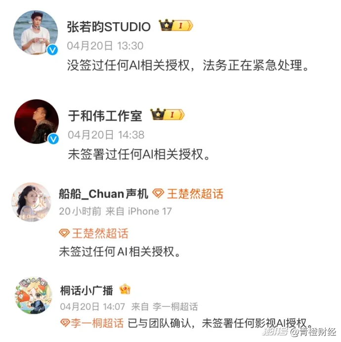 然而现实的反转来得猝不及防。大会结束后两小时内,被列入艺人库的多位艺人接连发声辟谣。张若昀工作室明确表示“未签署任何AI相关授权,法务正在紧急处理”,于和伟、李一桐、王楚然等十余名艺人也相继发布声明,直接划清界限。