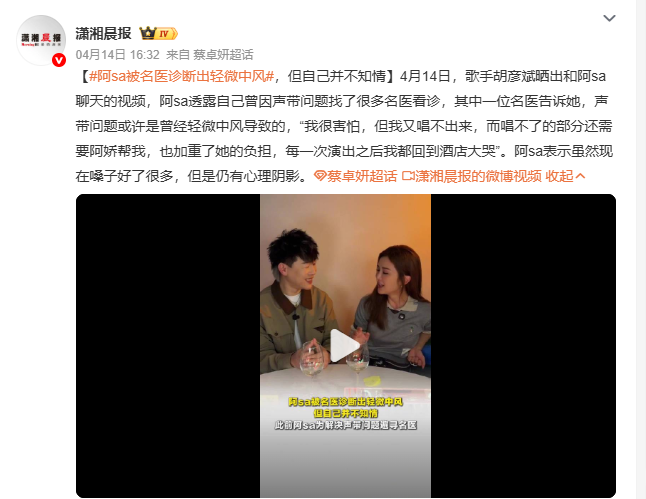近日,歌手蔡卓妍(阿Sa)透露自己曾一度发声困难,需打针才能开嗓,为此看了很多名医,其中一位医生表示她的声带问题可能是轻微中风所致,然而她此前毫无察觉。