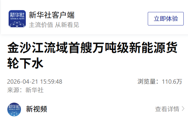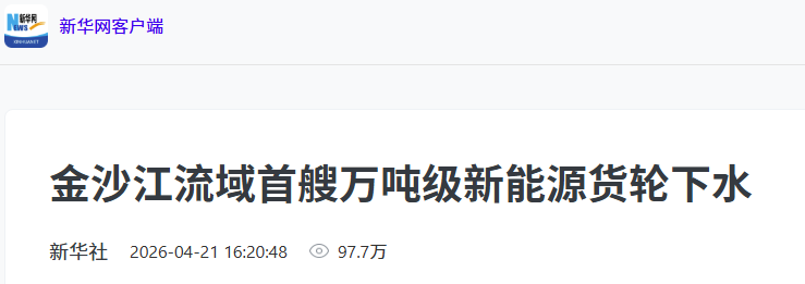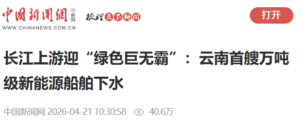 聚焦云南首艘万吨级新能源船舶顺利下水情况,人民网、新华社、新华网、央视新闻、央视网、中国新闻网、中国日报网、《云南日报》、云南发布等多家央级、省级媒体刊发稿件。截至2026年4月24日,央地四级媒体刊发相关稿件180余篇次,其中中央、省级主要媒体20余篇次。