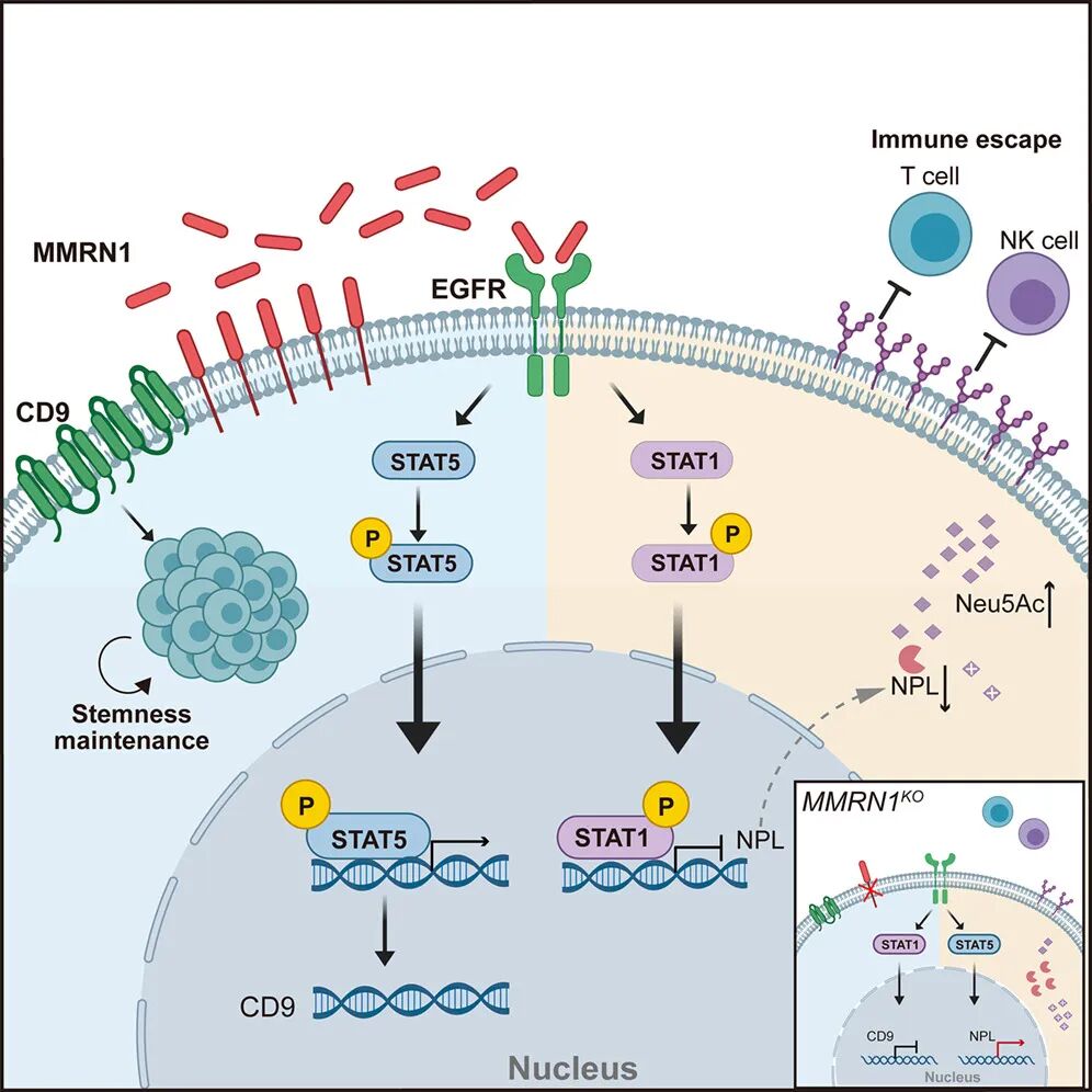 从机制上来说,MMRN1 通过其表皮生长因子(EGF)样结构域激活 EGFR/STAT1 信号通路,抑制 N-乙酰神经氨酸(Neu5Ac)的降解,从而驱动唾液酸糖链的积累。这些唾液酸糖链形成功能上类似于 PD-1/CTLA-4 的糖免疫检查点。具体而言,这些唾液酸糖链激活了唾液酸糖链-Siglec 免疫检查点信号轴,损害了 T 细胞/ NK 细胞活性,使白血病干细胞(LSC)得以逃逸免疫攻击。此外,MMRN1 还通过 EGFR/STAT5/CD9 通路维持 LSC 的自我更新能力。