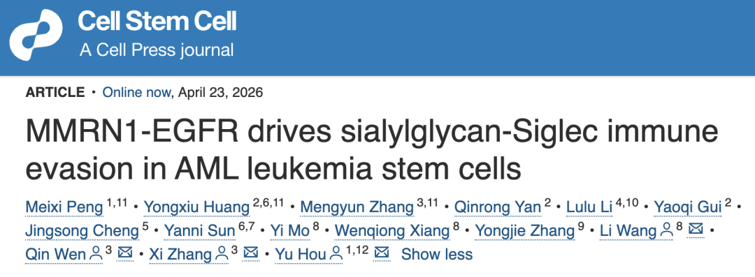 2026 年 4 月 23 日,重庆医科大学基础医学院侯宇教授团队联合陆军军医大学新桥医院张曦教授、文钦教授团队及重庆医科大学附属第一医院王利教授团队(彭美茜、黄永秀、张梦芸为论文共同第一作者),在 Cell Stem Cell期刊发表了题为:MMRN1–EGFR drives sialylglycan–Siglec immune evasion in AML leukemia stem cells的研究论文。