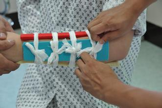 2.缚扎:用布条、腰带或植物的藤条等在伤口上方(近心端)约10厘米或距离伤口上一个关节的相应部位进行缚扎。缚扎千万不要太紧,不要用止血带结扎。每30分钟放松1次,每次松2-3分钟,以免影响血液循环造成组织坏死。有条件推荐使用小夹板固定的方式进行缚扎。到达医院处理后应及时解除。