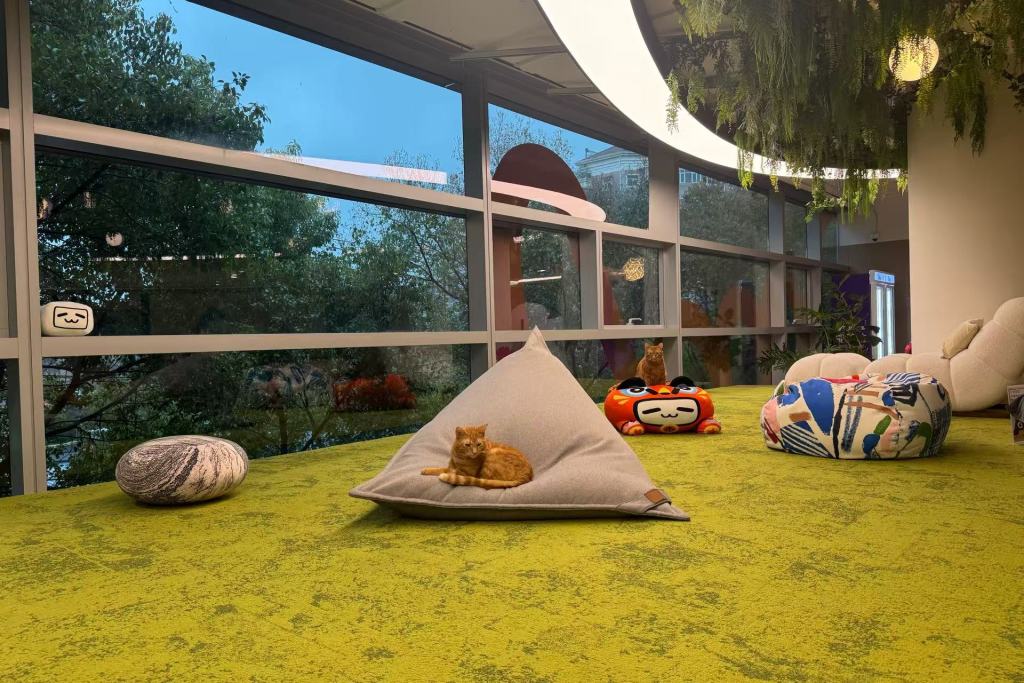 咖啡吧则遍布在从一楼到三楼的整个空间,三楼“果缤纷魔方厅”还“长”出了猫员工,两只橘猫、一只蓝猫把“减压”写进空间基因,当你在桌前开电话会,它们会自动把头“塞”进你的手里。除了这三个场地内的“猫员工”,研究员在走道里还碰上别的猫猫狗狗,这是因为整个空间宠物友好,允许员工带着宠物上班。