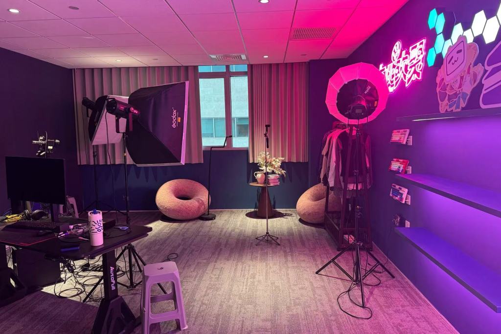 V聚场的解法是“共享化”与“专业化”。根据平面布局图,三层设有西瓜直播间(访谈风格)、菠萝直播间(电竞风格)、草莓直播间(绿幕)。在直播间内,相机、灯光、电脑一应俱全,创作者可根据需求选择场景,进行电竞直播、带货直播、访谈直播等。2026年1月19日至1月25日,哔哩哔哩年货节直播便在V聚场三楼草莓直播间举行。