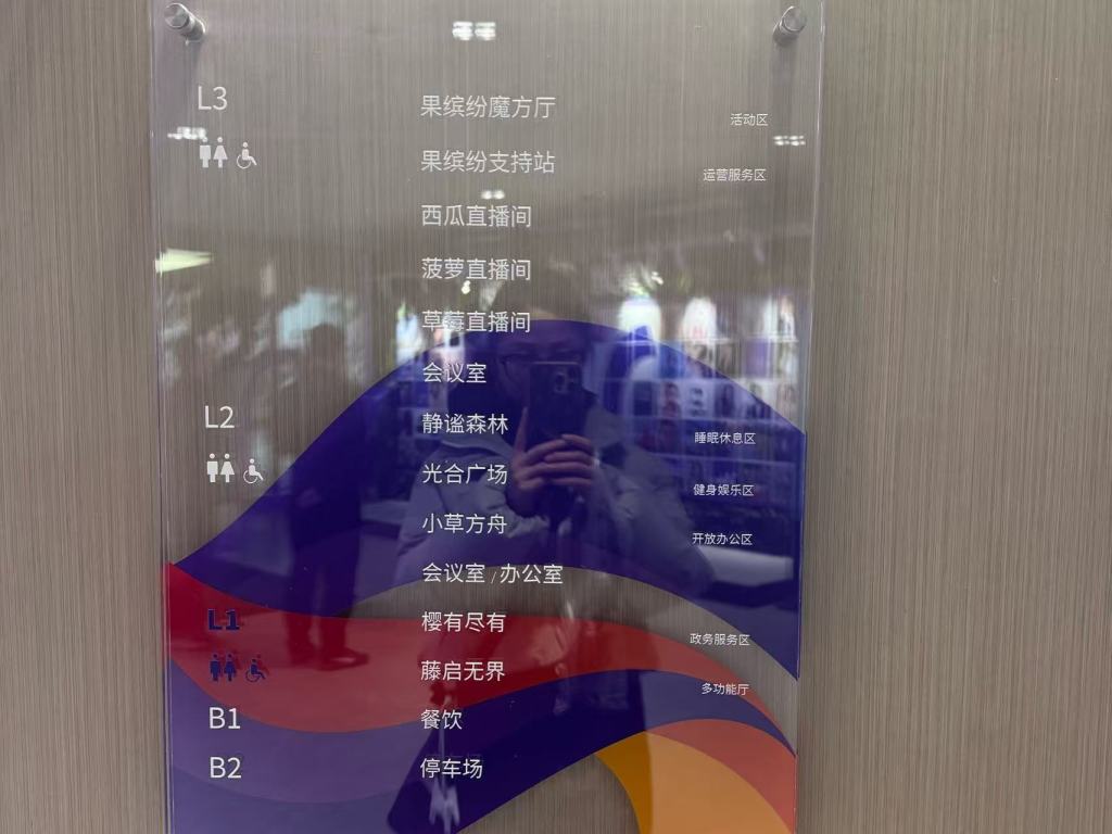 研究员调研发现,在V聚场中,开放办公室(“小草方舟”,2层)与独立办公室(2层)合计仅占整个空间不足三分之一的面积。提供服务价值的政务服务中心(“樱有尽有”,1层),提供专业价值的直播间(3层)与多功能厅(“藤启无界”,1层),提供情绪价值的睡眠休息区(“精密森林”,2层)、健身娱乐区(“光合广场”,2层)及活动区(“果缤纷魔方厅”,3层)等功能区,这些合计占超过三分之二的空间,精准回应了优质内容创作者的深层需求。