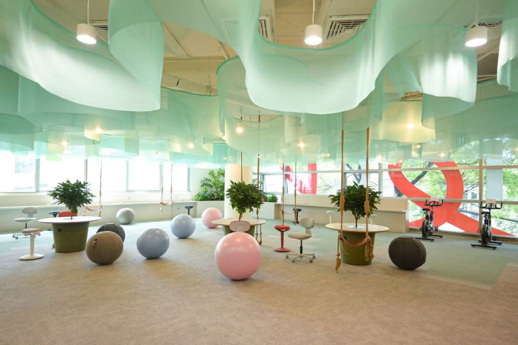 V聚场2楼,一出电梯是娱乐健身区,秋千、瑜伽球、健身车,将松弛感注入空间基因。图片来源:V聚场