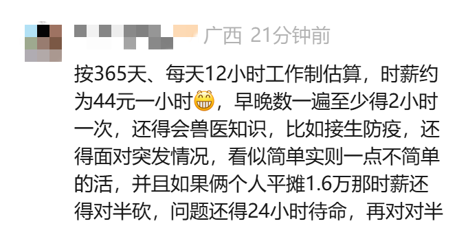 有经验的网友认为,这项工作看似高薪,但需要员工会兽医知识,比如接生、防疫等,还得面对突发情况,还要忍受零下四十摄氏度的低温,实则异常辛苦劳累。