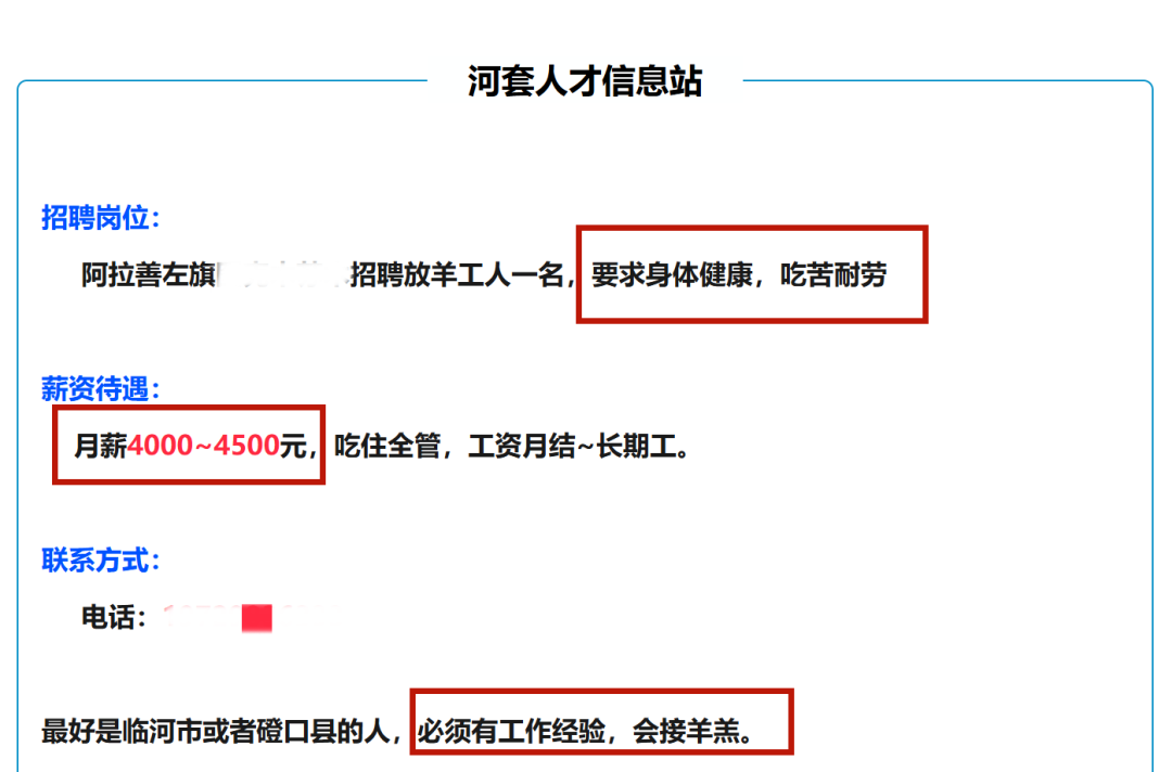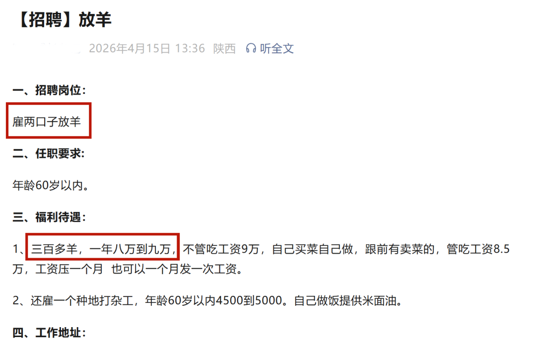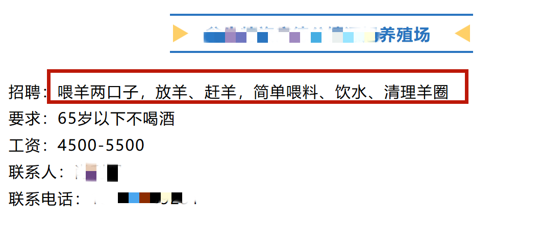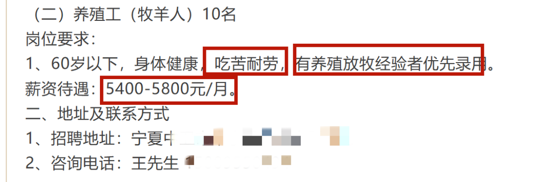 同时,岗位工资3000元~5000元不等,管理的牛羊群规模常常是数百只,并强调“吃苦耐劳”,需要掌握一定的畜牧技能,工作内容极为繁杂。