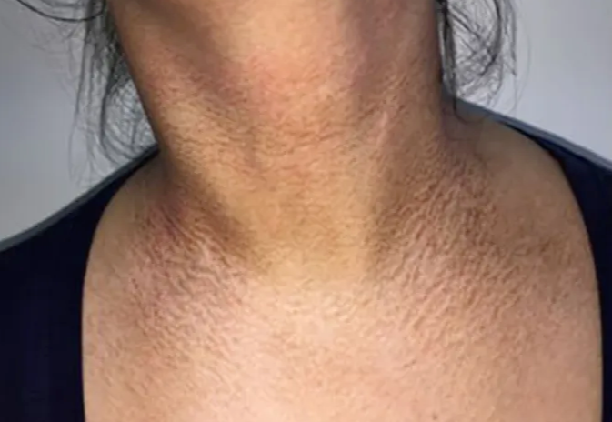 脖子前面或侧面出现弥漫性的褐色暗沉斑片,表面轻微粗糙或有细屑,看着像没洗干净。