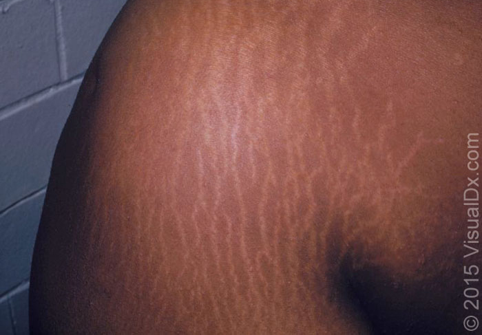 因体重波动或生长过快导致真皮层弹力纤维断裂,就像孕妇肚子上的纹路一样,这与激素水平变化有关,也不是病。
