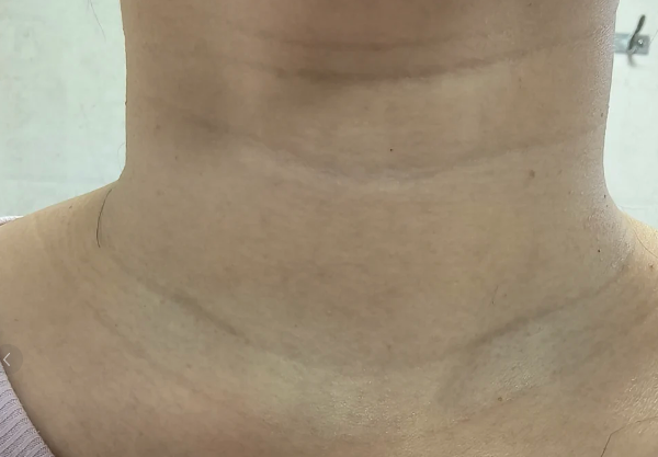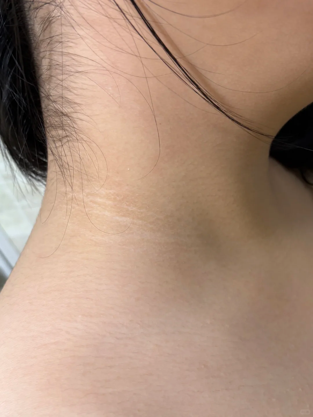 低头、仰头时皮肤挤压形成的物理折痕,只要舒展脖子,痕迹就会变浅。