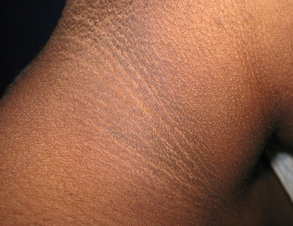 它好发于颈部、腋下、腹股沟等皮肤褶皱部位,出现一片片灰褐色色素沉着斑块,皮肤粗糙增厚,质地像天鹅绒,并非污垢,怎么洗也洗不掉。