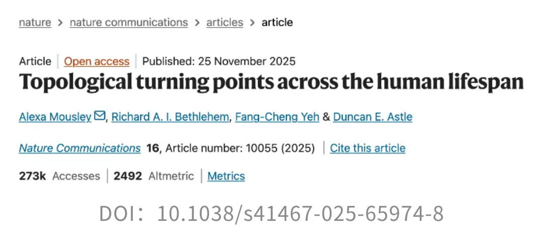 [2]Mousley A, Bethlehem RAI, Yeh FC, Astle DE. Topological turning points across the human lifespan. Nat Commun. 2025 Nov 25;16(1):10055. doi: 10.1038/s41467-025-65974-8. PMID: 41290675; PMCID: PMC12647875.
