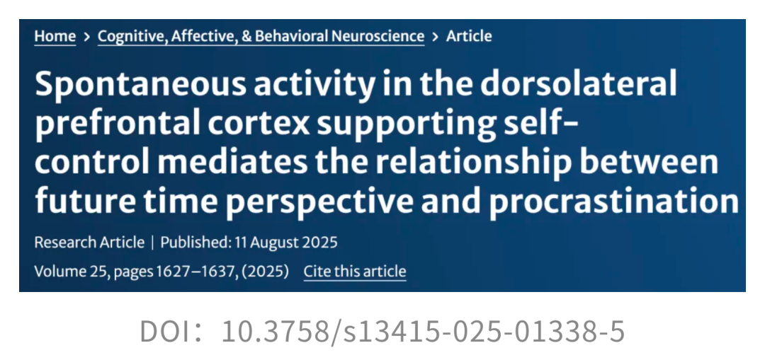 [4]Lu, J., Zhang, R., Tong, T.et al. Spontaneous activity in the dorsolateral prefrontal cortex supporting self-control mediates the relationship between future time perspective and procrastination. Cogn Affect Behav Neurosci 25, 1627–1637 (2025). https://doi.org/10.3758/s13415-025-01338-5