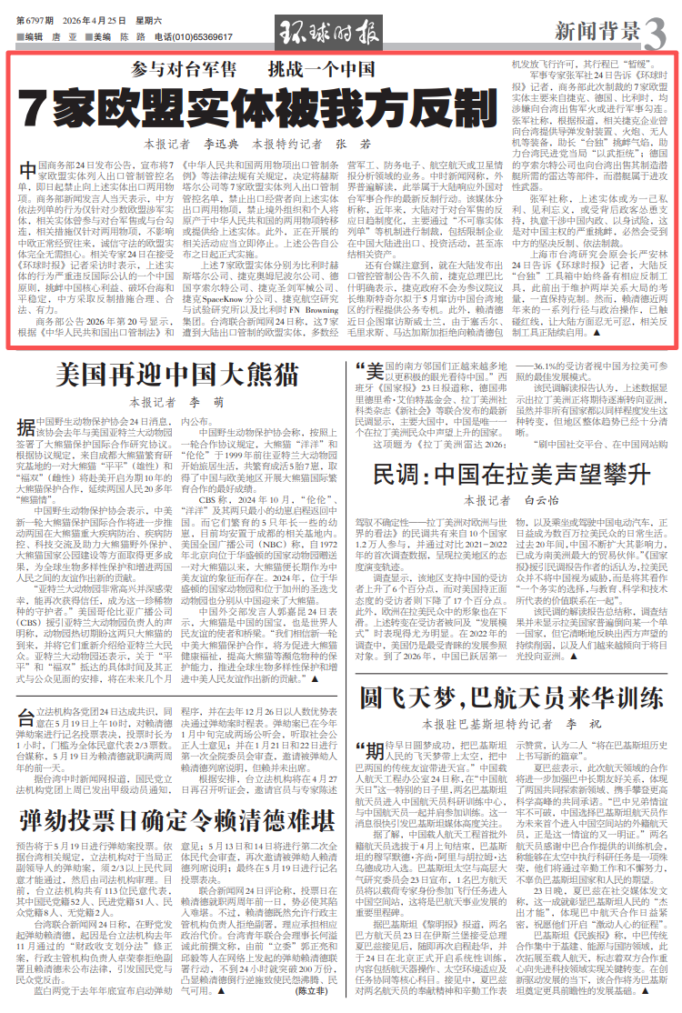商务部新闻发言人当天表示,中方依法列单的行为仅针对少数欧盟涉军实体,相关实体曾参与对台军售或与台勾连,相关措施仅针对两用物项,不影响中欧正常经贸往来,诚信守法的欧盟实体完全无需担心。相关专家24日在接受《环球时报》记者采访时表示,上述实体的行为严重违反国际公认的一个中国原则,挑衅中国核心利益、破坏台海和平稳定,中方采取反制措施合理、合法、有力。