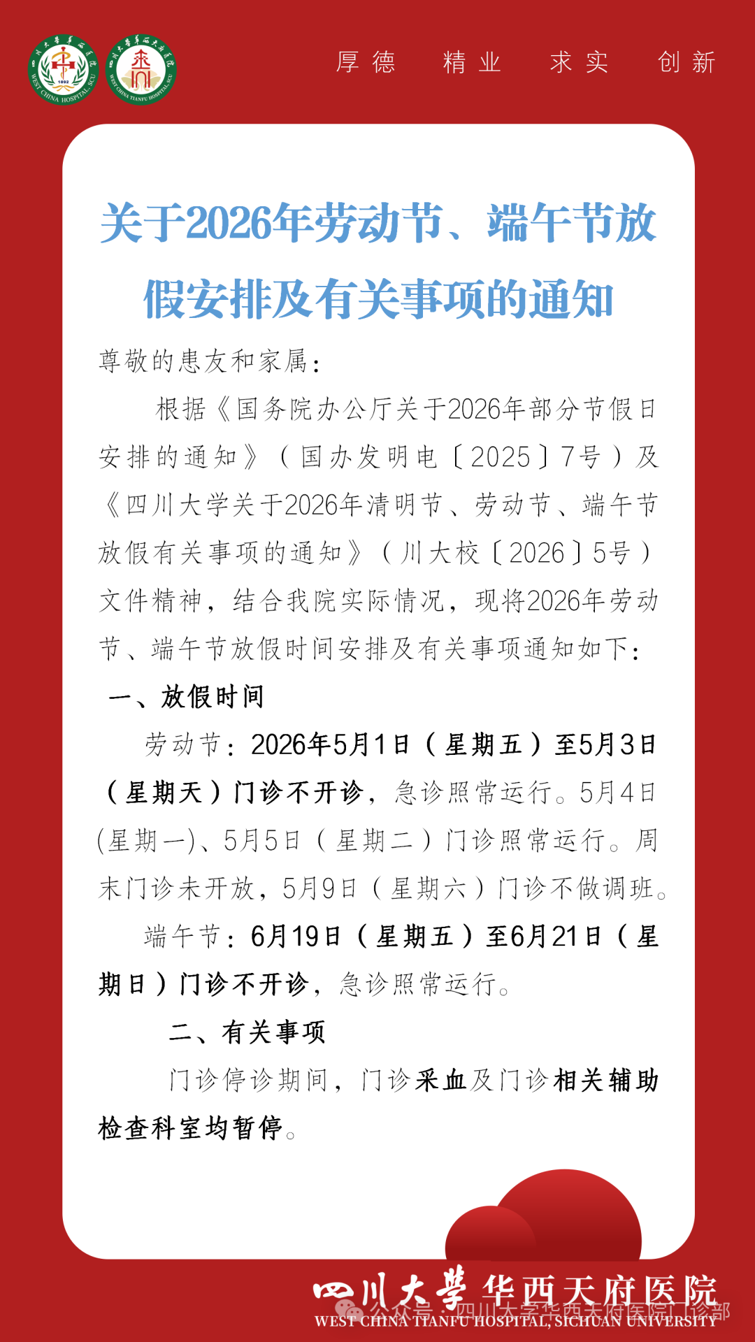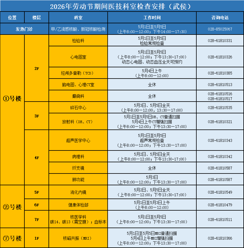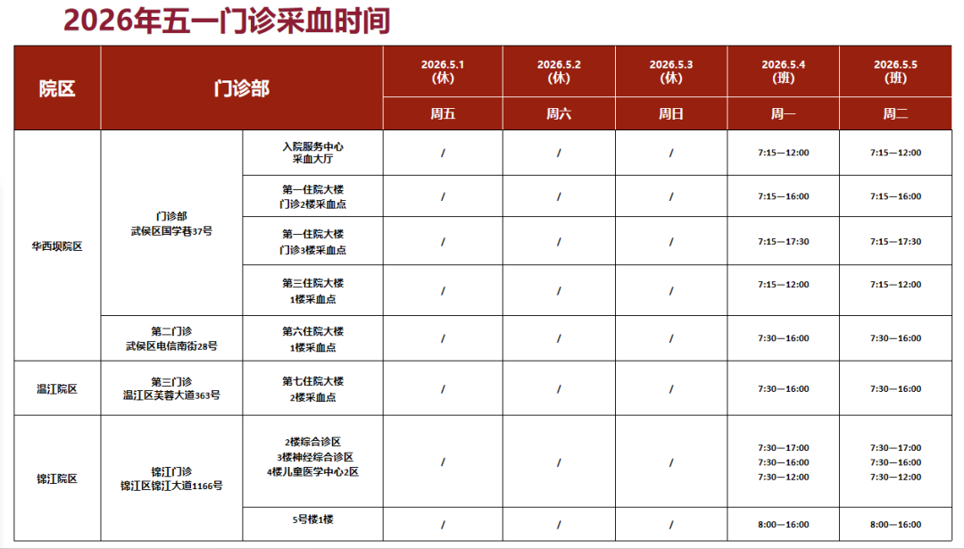 5月1日至5月3日门诊含采血及检查科室(包括华西坝院区、温江院区、锦江院区)停诊3天,急诊(华西坝院区、锦江院区)照常运行。