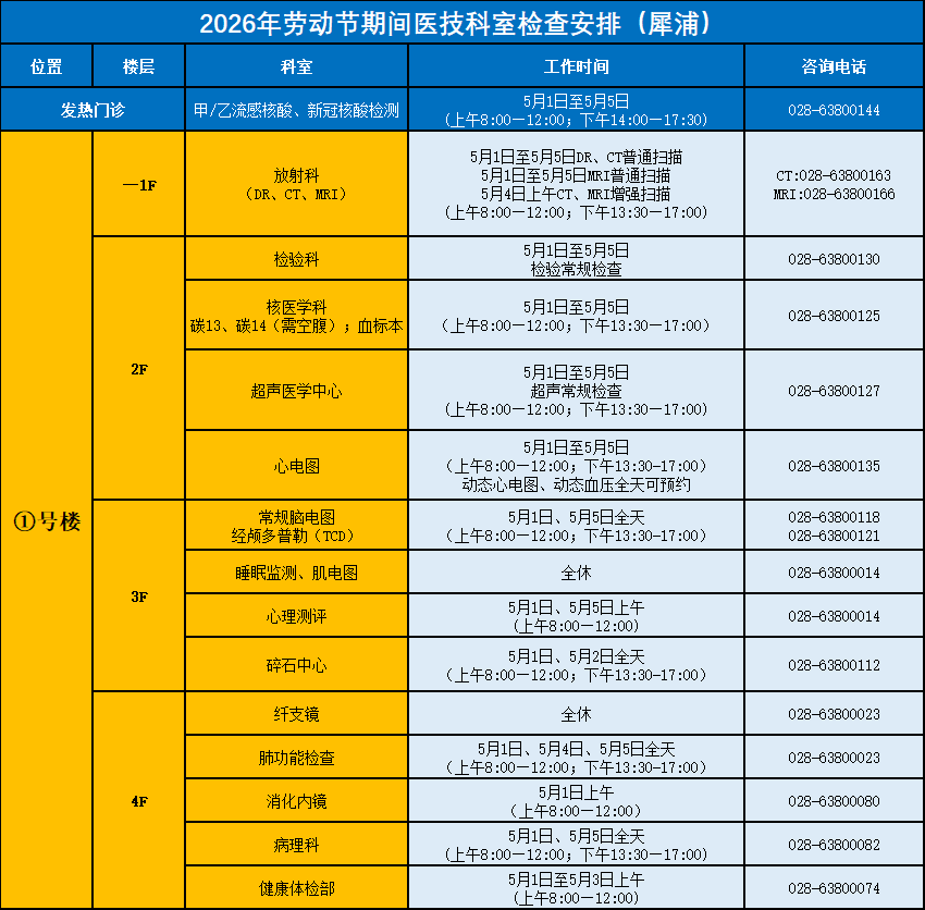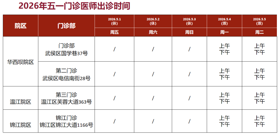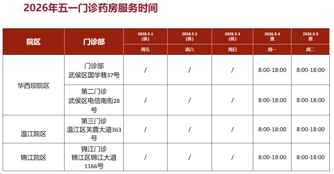 1. 院本部(青羊院区)、龙泉院区、草堂院区(四川省老年医学中心)、皮肤病性病研究所(四道街院区)、四川省精神医学中心(温江院区)门诊5月1日至5月5日(周五至周二)正常开诊。