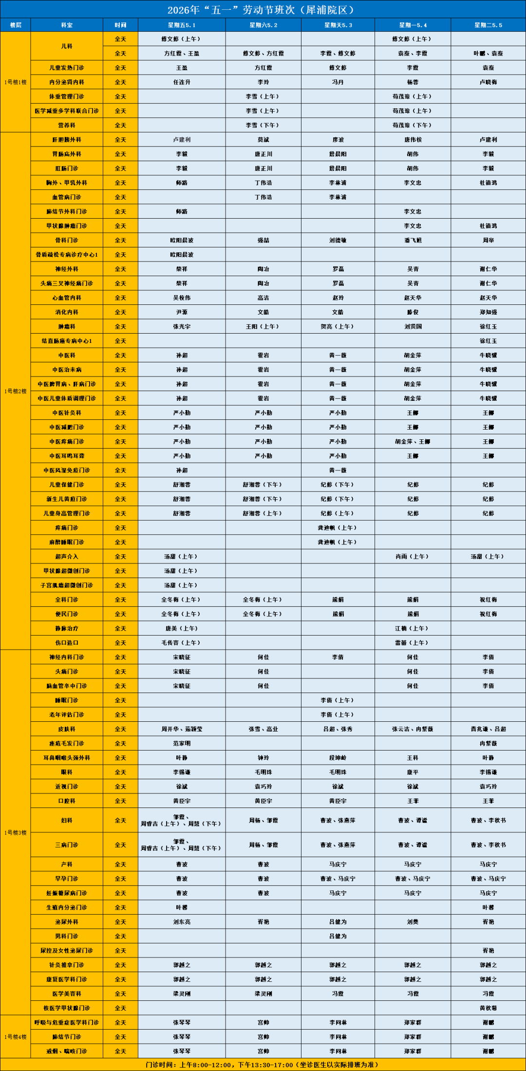 按照国家“五一”劳动节放假安排,医院门诊工作安排如下:2026年5月1日—5月5日放假。