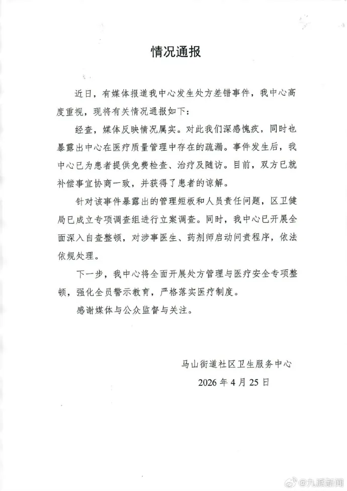针对该事件暴露出的管理短板和人员责任问题,区卫健局已成立专项调查组进行立案调查。同时,我中心已开展全面深入自查整顿,对涉事医生、药剂师启动问责程序,依法依规处理。