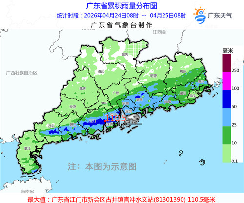 据气象水文监测,24日08时到25日08时,全省有2个镇街录得超过100毫米的大暴雨,有64个镇街录得50毫米~100毫米的暴雨,有375个镇街录得25毫米~50毫米的大雨,各市雨量最大的镇街有:江门新会区古井镇110.5毫米、茂名高州市云潭镇108.4毫米、珠海斗门区斗门镇96.5毫米。