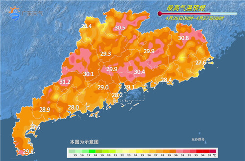 27日,清远、韶关、云浮、茂名和珠三角西部市县多云转(雷)阵雨,局部大雨或暴雨,其余市县多云间晴天,局部有(雷)阵雨。最高气温:清远、韶关和珠三角西部市县25~27℃,其余大部分市县28~32℃。
