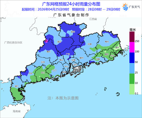 25-26日,南部市县多云到阴天,局部有阵雨,其余市县晴到多云,部分市县早晚有(轻)雾。最高气温:25日,粤西、珠三角大部分市县27~29℃,其余市县23~27℃;26日,大部分市县28~32℃。