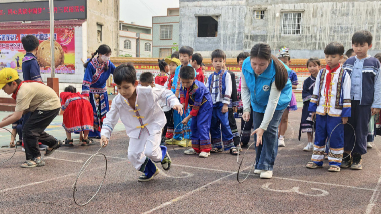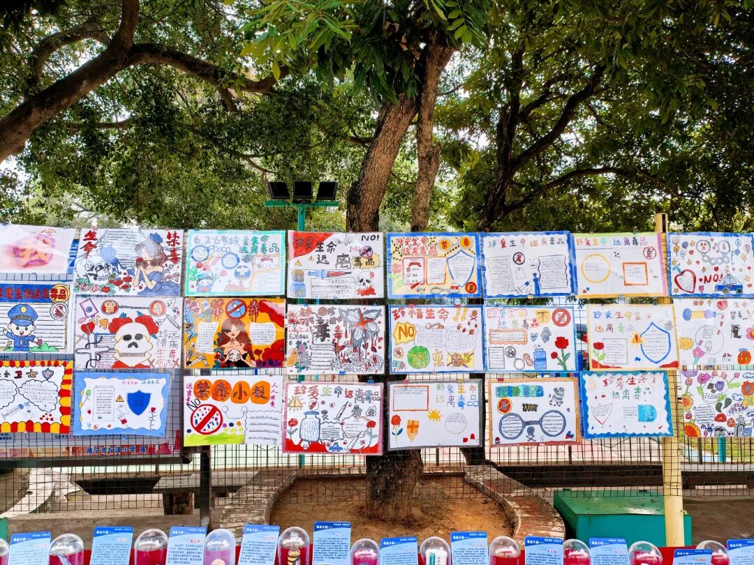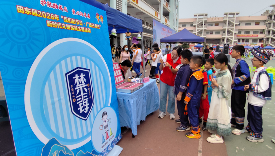田东县禁毒工作专班办公室借当地举办“我们的节日・广西三月三” 主题活动的契机,在活动现场的平马镇中山小学开展 “锥桶套圈”等禁毒知识趣味互动问答活动。