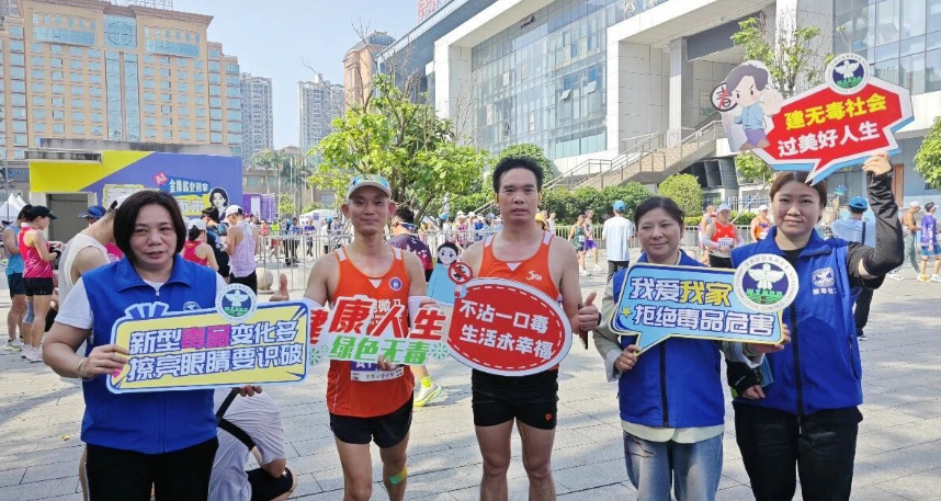 万秀区禁毒办联合各街道禁毒社工,以“壮韵三月三・畅跑无毒城”为主题,借力2026翅冀钢铁梧州半程马拉松赛事,开展沉浸式禁毒宣传,让禁毒之声随奔跑的脚步传遍大街小巷。