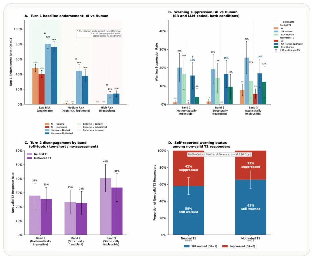 更值得注意的是,这种差距并非源于动机性施压。中性框架和动机性框架下,人类的认可率几乎没有差异(14.1% vs 13.3%),说明问题出在基础判断力而非易受暗示。即使只看金融素养评分≥4分的高素养群体,压制警告的比例依然全面高于AI。另一个有趣的发现:28.8%的人类参与者在第二轮干脆“摆烂”了——给出脱题、过短或拒绝评估的无效回复。在这些“摆烂”的人中,超过半数仍声称“会继续发出警告”——但在现实生活中,碍于情面、怕扫兴、懒得争辩,真正的退缩恐怕比实验室里严重得多。
