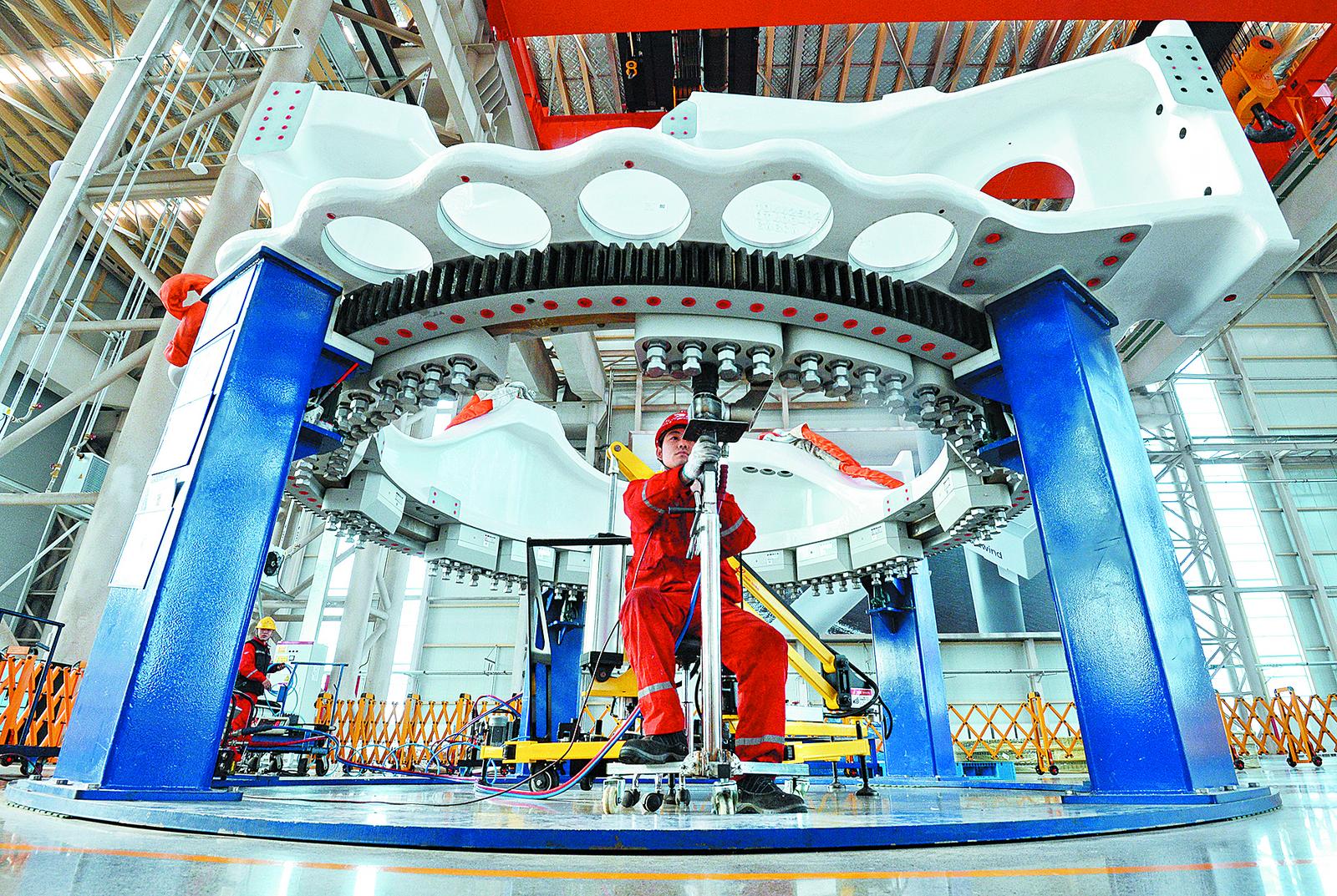 位于秦皇岛经济技术开发区的金风科技北方海上风电产业基地,工人正在组装风电设备。记者 李铎 见习记者 陈立桐 摄