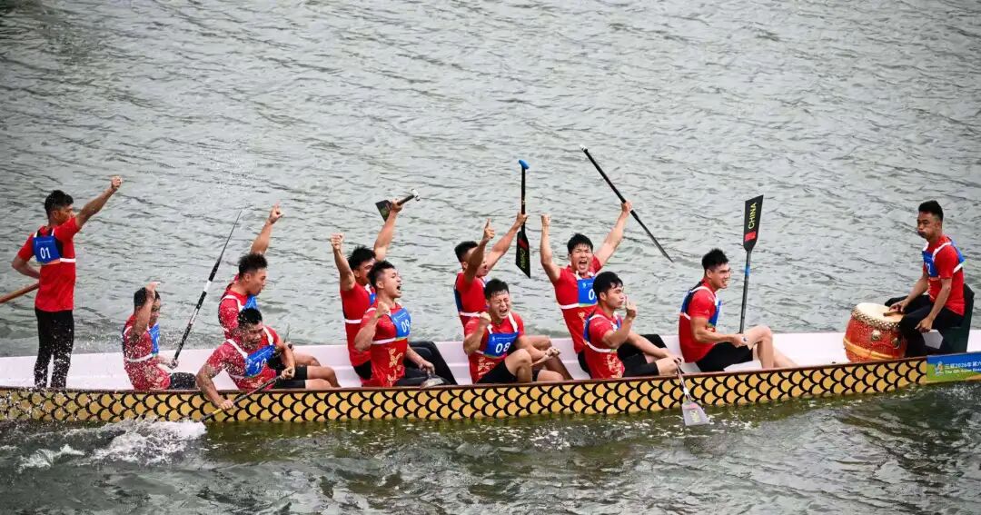 在随后进行的男子组龙舟赛决赛中,中国队一路领先冲过终点,以24.076秒的成绩夺冠。这是中国队历史上首次获得亚沙会龙舟男子项目金牌。