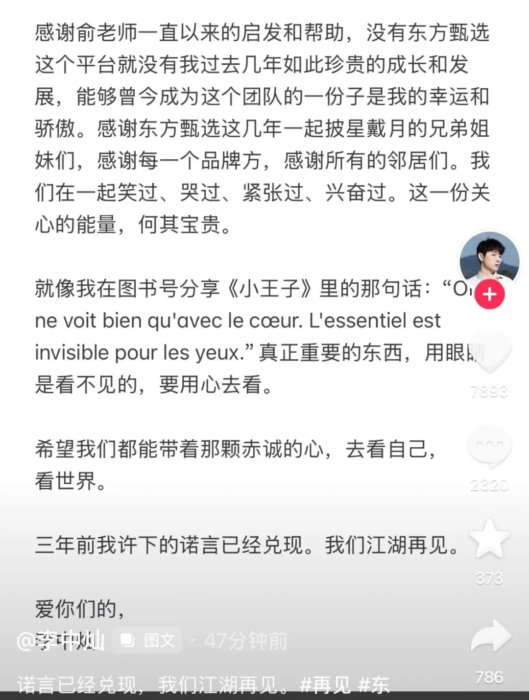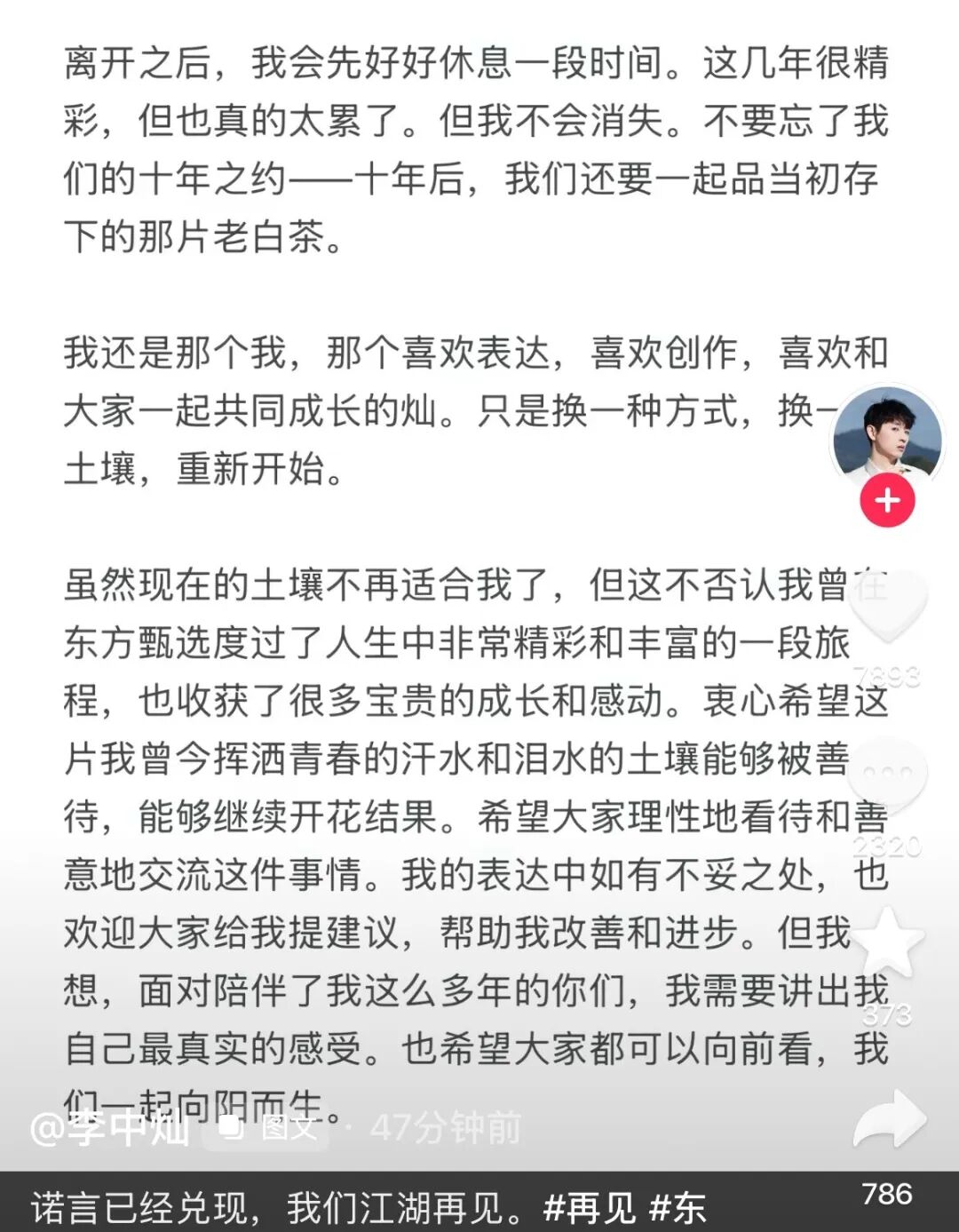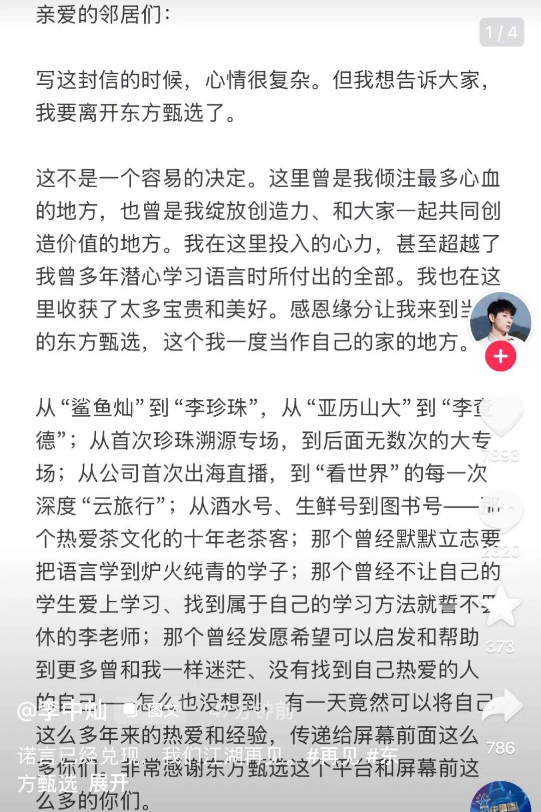 4月25日下午,东方甄选明明在社交账号发文回应离职,原文如下: