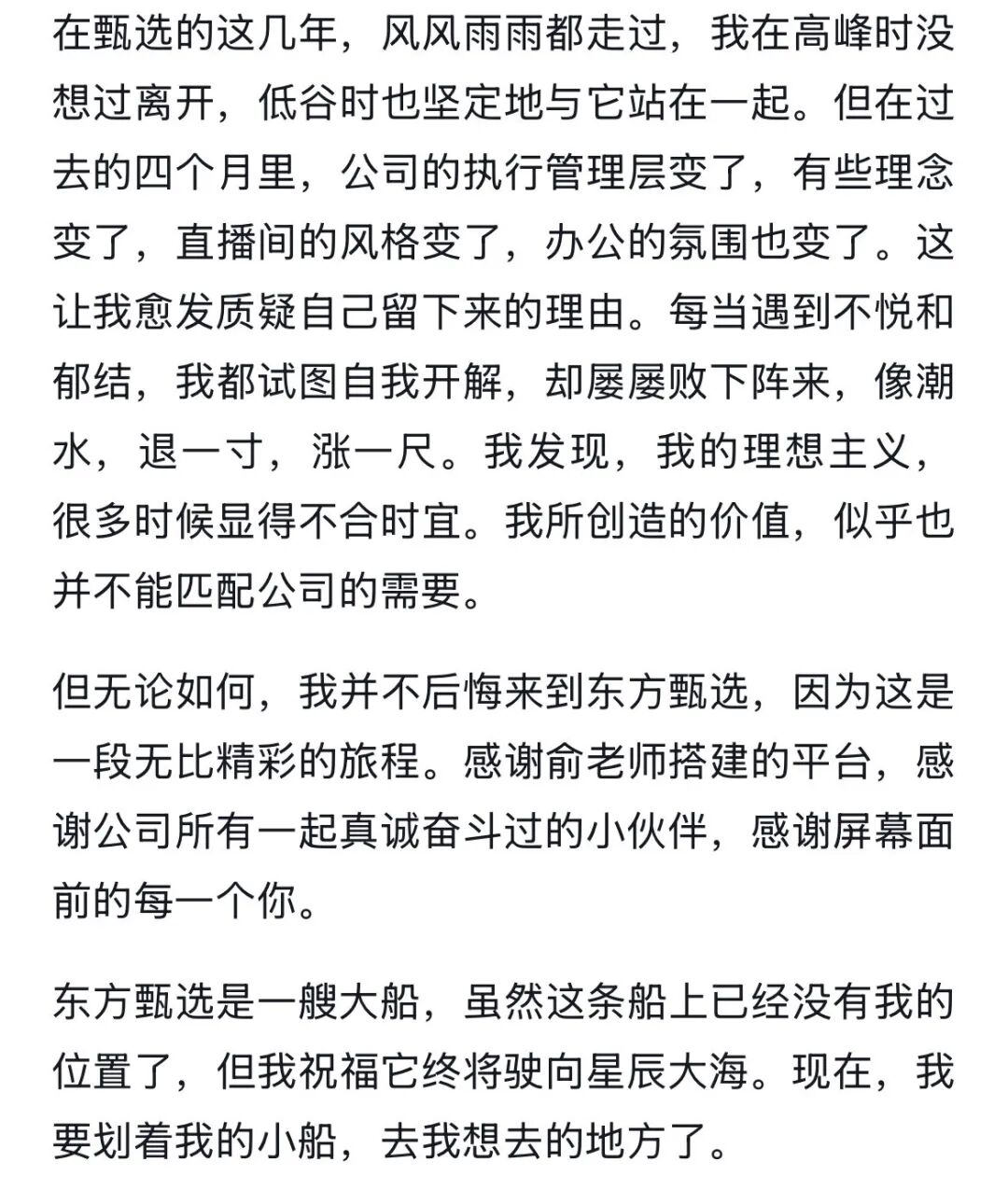 东方甄选明明回应离职:新任管理层对我的“不友好”,让我陷入严重焦虑与内耗;此前主播天权回应离职也曾提到“管理层变动”