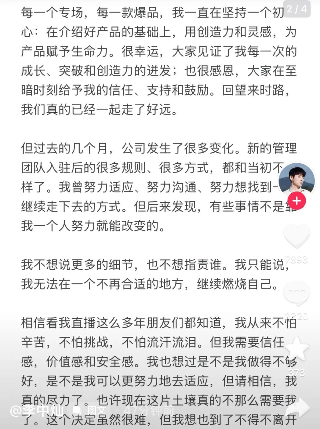主播天权发文回应离职: