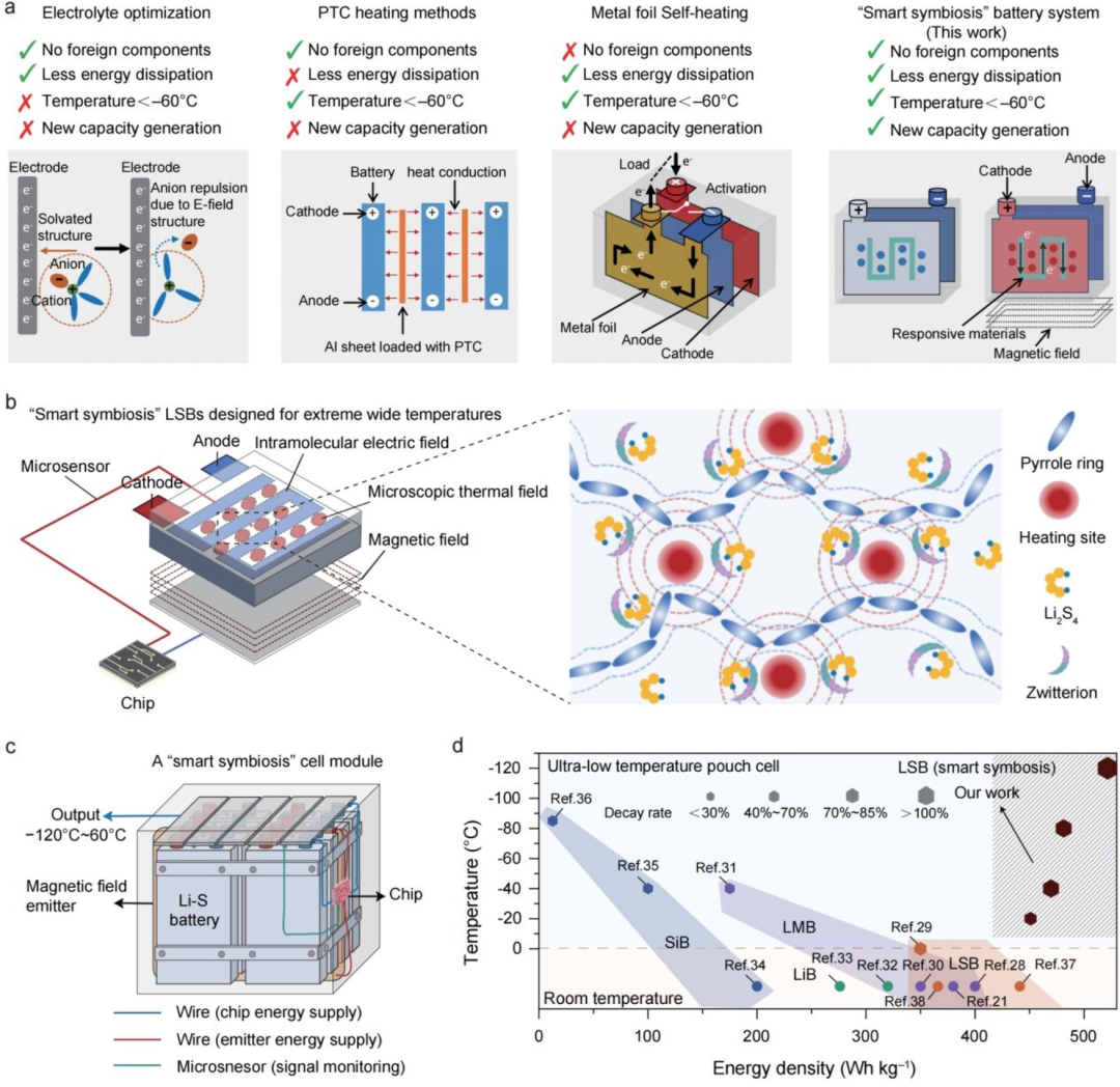 团队跳出传统材料改性思维,打造“智能共生”系统,集成微型温度传感器、智能控制芯片与磁响应正极材料。传感器实时捕捉温度,芯片动态调控交变磁场,特制正极对磁场响应,基于多物理场协同效应,可使电池在低温环境中能够像生物一样自适应自调节,突破低温转化壁垒。