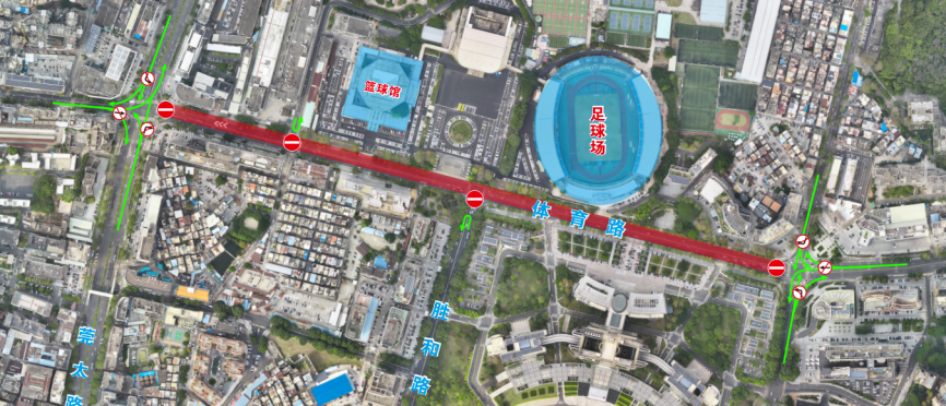 实施临时双向交通管控。届时,禁止所有社会车辆从莞太路进入体育路、从胜和路直行进入体育路、从石竹路进入体育路、从元岭路进入体育路。