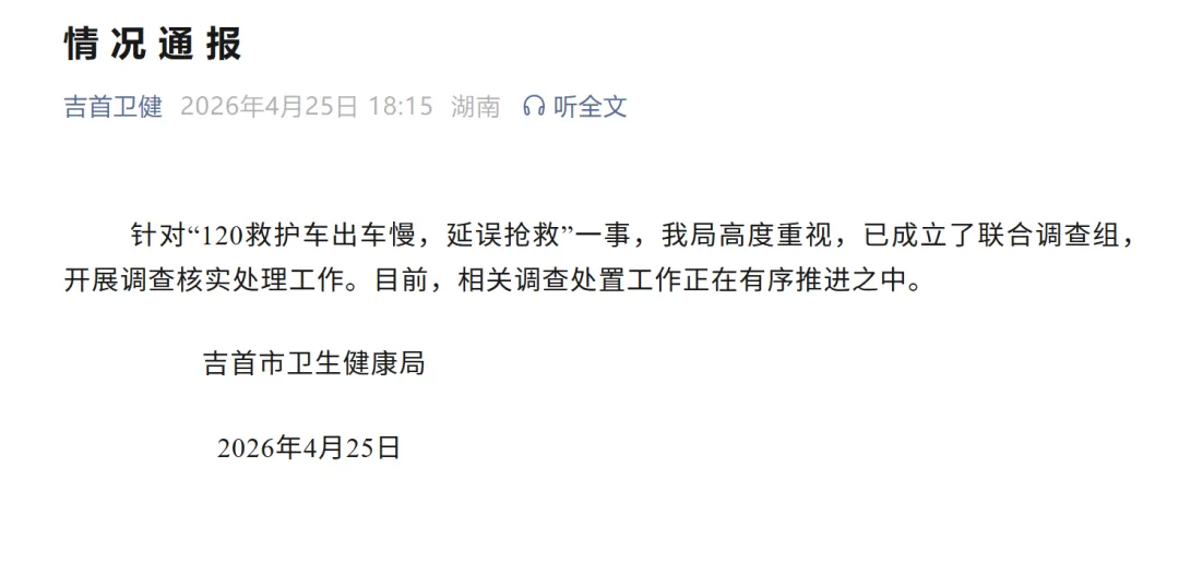 原标题:《湖南一父亲投诉救护车出车慢致1岁幼子延误抢救身亡,官方通报:已成立联合调查组》
