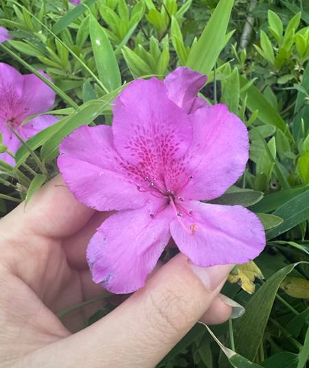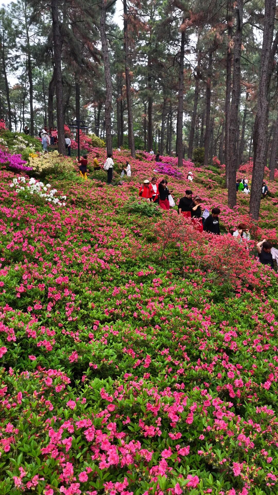 说来惭愧,在杭州住了七年,头一回认真端详杜鹃。从前只觉得春天该看郁金香,该看桃花,该看中国红樱,看那些轰轰烈烈的、上了新闻的花事。断桥边的人潮、太子湾的长队,我也曾是其中一员,拥挤在人潮中看花。可偏偏是今天,这条不知名的小径,这些紫得发颤的杜鹃,让我走不动路了。